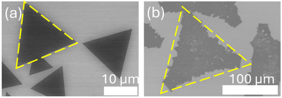 - Pokhrel, H.; Duncan, J.J.A.; Krause, B.; Hoang, T.B.; Pollard, S.D. Transformation from dendritic to triangular growth of WS2 via NaCl assisted low-pressure chemical vapor deposition. J. Vac. Sci. Technol. A 2024, 42, 042203. [Google Scholar] [CrossRef]