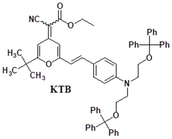 Ethyl 2-(2-(4-(bis(2-(trityloxy)ethyl)amino)styryl)-6-tert-butyl-4H-pyran-4-ylidene)-2-cyanoacetate (KTB) is a novel non-symmetric red, near-infrared light-emitting dye, as depicted in Figure 1. This molecule comprises a 4-substituted-4H-pyran as an electron acceptor and an electron donor group with two bulky trityloxyethyl groups attached at the donor side. The presence of these bulky trityloxyethyl groups serves to weaken intermolecular interactions, thereby reducing crystallization and facilitating the preparation of amorphous thin films from the solution. KTB demonstrates excellent solubility in chloroform and dichloromethane. For a comprehensive synthesis of KTB, please refer to the detailed description provided elsewhere [33].
