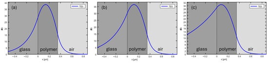 Light confinement in the planar waveguide for (a) PVK, (b) PSU, and (c) PS. Calculations were conducted in the OMS program.