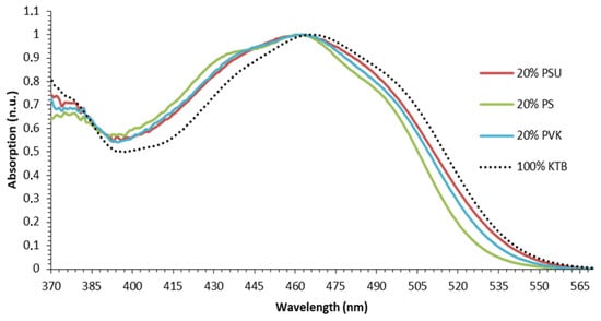 The normalized absorption spectrum of the pure KTB sample and samples containing 20 wt% of KTB in PVK, PSU, PS matrices are depicted in Figure 4. The maximum absorption bands are typically around 471 nm, with slight variations of up to 10 nm depending on the host polymer. The shapes of these spectra exhibit similarities, with slight broadening observed as the dielectric constant of the polymer increases from PS to PVK. These changes in the maximum absorption position and spectral broadening can be attributed to the solvation of KTB within the polymer matrix, influenced by the varying dielectric constants of the solid solution systems. This leads to the reorganization of solvent and solute molecules into solid solvation complexes, resulting in alterations in the stabilization of the dye molecules’ ground and first excited states, manifesting as shifts in the shape and intensity of certain bands in the absorption spectrum [35].