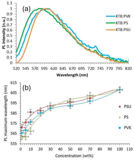 (a) Photoluminescence spectra of 20 wt% KTB compound in different polymers. (b) Wavelength of photoluminescence maximum at different KTB concentrations.