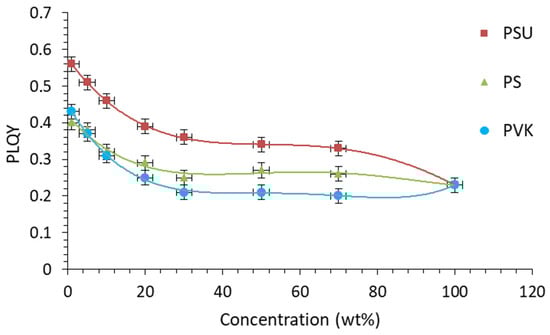 In all host–guest systems investigated, the increase in KTB concentration results in a decrease in the photoluminescence quantum yield (PLQY), as shown in Figure 6. This decrease is attributed to the heightened intermolecular interaction between KTB molecules, which occurs as the distance between chromophore molecules decreases. At low concentrations (<5 wt%), the KTB:PSU system exhibits the highest PLQY at 56%. The PLQYs of the KTB:PS and KTB:PVK systems at low concentrations are comparable, at 40% and 43%, respectively. Across all weight ratios, the KTB:PSU system consistently demonstrates the highest PLQY, surpassing those of the KTB:PS and KTB:PVK systems by a factor of 1/3 or more. The varying patterns of PLQY decreases in systems at higher concentrations may be attributed to differences in the length and structure of the polymer chains. For instance, in systems with longer molecular chains (such as PSU), the reduction in distance between chromophore molecules is not as pronounced, even at high KTB concentrations, unlike in PVK and PS systems. This suggests that a PSU polymer mitigates the interaction between KTB molecules, thereby reducing photoluminescence quenching and resulting in higher PLQYs in the KTB:PSU systems. Even at very high concentrations (70 wt%) of KTB, the PLQY of the KTB:PSU system exceeds that of pure KTB by a factor of 1/3.
