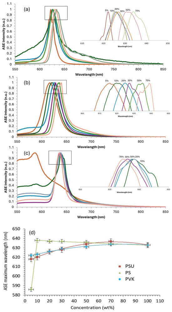 Amplified spontaneous emission spectra at different dye concentrations in the (a) PVK, (b) PSU, and (c) PS matrices. (d) Dependence of ASE maximum wavelength on dye concentration.