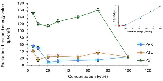 The ASE excitation threshold energy is determined from the emission intensity changes by inversing the excitation pulse energy (see the inset of Figure 8). A detailed description can be found in [32]. The lowest ASE excitation threshold energy value of 9 μJ/cm2 was achieved in the KTB:PVK system at a 20 wt% concentration of dye molecules, while the lowest value of 16 μJ/cm2 was reached in the KTB:PSU system at 10 wt%. These values are among the lowest for red-light-emitting laser dye systems.