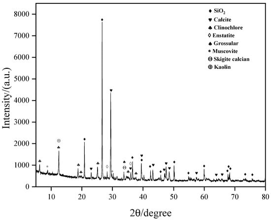 The primary materials utilized in this study are tungsten tailings, sodium hydroxide (NaOH), and potassium hydroxide (KOH). The tungsten tailings, serving as the precursor, are sourced from Guilin in southern China. Sodium hydroxide and potassium hydroxide, used as activators, are produced by China National Pharmaceutical Group Chemical Reagent Co., Ltd. In Nanjing, Jiangsu. The tungsten tailings appear as a gray-white powder with a specific gravity of 2.76. These tailings are characterized by their fine and uniform particles, with more than 84% of the particles distributed between 0.075 mm and 0.2 mm, as detailed in Figure 1. Based on the particle size distribution curve, the tungsten tailings can be classified as fine sand. X-ray diffraction (XRD) was conducted using an X-ray diffractometer (model: ESCALAB 250Xi). The analysis results are presented in Figure 2, revealing that quartz and calcite are the predominant minerals, collectively constituting 74% of the tailings. Additional minor components include kaolin, chlorite, calcareous garnet, pyroxene, and micro-plagioclase. Fluorescence spectrometry was employed to identify the main oxide constituents in the tailings, which include SiO2, CaO, Fe2O3, and Al2O3, together accounting for over 88% of the content, alongside trace amounts of MgO, K2O, SO3, P2O5, etc., as illustrated in Table 1. Microscopic examination (Figure 3) shows that the tungsten tailings primarily exhibit a sheet-like, loose, and disordered structure.