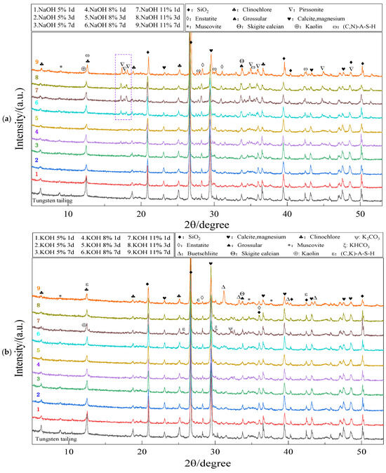 XRD diffractograms of the tungsten tailings activated by (a) NaOH; (b) KOH and cured at 80 °C for different times.