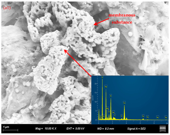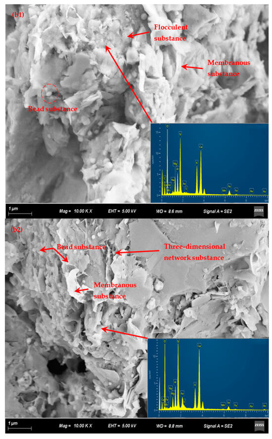 Figure 6(b1–b3) display the microstructure of the tailings activated with KOH solutions, offering a comparison to those treated with NaOH (Figure 6(a1–a3) vs. Figure 6(b1–b3)). The microstructural morphology in specimens treated with KOH solution remains similar to the original tailings but changes over time. The flake boundaries blur due to the formation of membranous gels (Figure 6(b1,b2)), and the formation of three-dimensional network structures causes particles to arrange disorderly (Figure 6(b3)). Bead-like substances stack on the surfaces of flaky minerals, a common feature across all samples. EDS results confirm that the membranous and network substances are (C, K)-A-S-H gels, and the bead-like substance is K2Ca(CO3)2, resulting from excess potassium oxide. These findings are consistent with the XRD results shown in Figure 5b, specifically at line 9 (2θ = 31°).