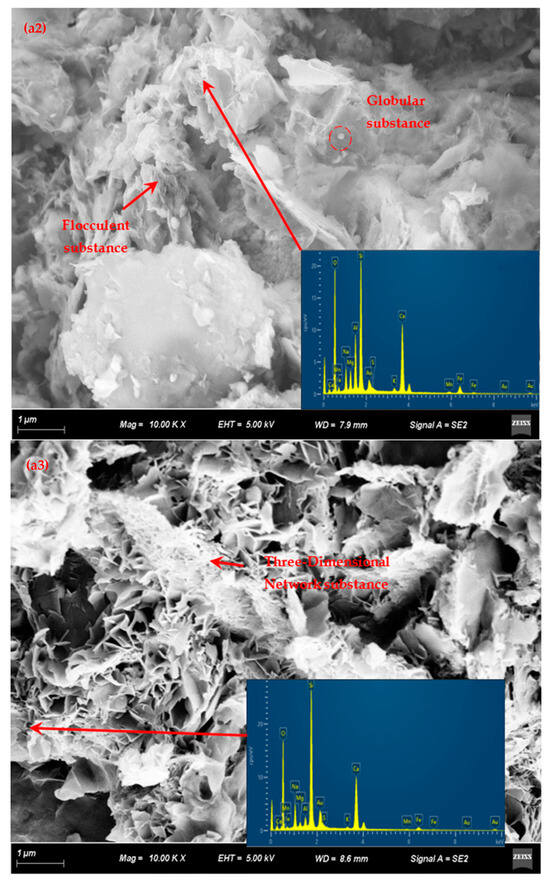 As the curing time and alkali content increase, the number of formed colloids also increases, and theoretically, the crystallinity of these colloids should improve. However, no significant diffraction peaks were observed around 30 degrees (2θ) in the XRD patterns (as shown in Figure 5), and similar peaks were even found in the original tailings. Additionally, different gel morphologies were observed in the scanning electron microscope (SEM) analysis (as shown in Figure 6(a3)); however, no clear evidence of enhanced crystallinity was found. Therefore, this suggests that the (C, N)-A-S-H and (C, K)-A-S-H phases exhibit a high degree of amorphousness.