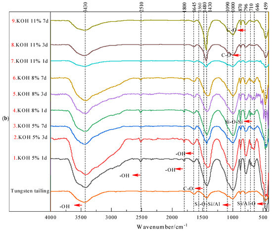 FTIR spectra of tungsten tailings activated by (a) NaOH and (b) KOH.