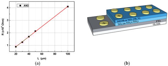 The resistivity of the NiO-based films was determined by employing the conventional four-probe Van der Pauw technique on films deposited on a glass substrate, having stripes, 800 μm long and 250 μm wide, and square pads with Au ohmic contacts (400 μm × 400 μm and 150 nm thick) deposited by electron beam evaporation. The quality of the Au metal as an ohmic contact on the NiO-based films of this investigation was tested by employing the linear transmission line measurement (l-TLM) technique [16,17,18] for films deposited on glass. Square Au pads having increasing distance, L, between each other were deposited on stripes of NiO-based films. By plotting the measured resistivity, R, between pads as a function of L, a straight line was obtained, from which the specific contact resistance between the Au metal and the film could be obtained. A typical example is seen in Figure 1a for the AN3 film (NiO:(Nb,N)). It was found that the specific contact resistance of Au on the NiO:Nb was 0.2 Ωcm2 and increased by one order of magnitude for the NiO:(Nb,N) film (2.6 Ωcm2). It should be remembered that the optimum ohmic contact on semiconductors should exhibit a specific contact resistance as low as 10−3–10−4 Ωcm2 [17,18]. Whenever p-NiO has been used in optoelectronic devices, Au [19,20,21], Ni/Au [22], Ag [23,24,25,26], Al [27], and Pt [28,29] have been reported as ohmic contact metals on p-NiO. No attempt was made to improve the ohmic contact behavior on p-NiO since it was beyond the scope of this investigation. The NiO:Nb/TiO2 and NiO:(Nb,N)/TiO2 heterostructures were fabricated by placing the TiO2/FTO/glass substrates in the sputtering chamber, and the depositions of the NiO:Nb and the optimum NiO:(Nb,N) thin films were made using the sputtering conditions described in Table 1. As an ohmic contact, sputtered Au metal was used for both the NiO-based and the FTO layers, using a specially designed shadow mask, which defined the junction area of the diode (7.8 × 10−3 cm2). A schematic representation of the fabricated NiO:Nb/TiO2 and NiO:(Nb,N)/TiO2 heterodiodes can be seen in Figure 1b. The diodes were characterized just after fabrication and after thermal treatment TT1 (300 °C, N2, 15 min).