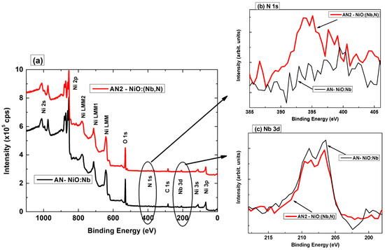 In order to investigate the effect of introducing N in the structure of Nb-doped NiO, the Ar flow was reduced in the plasma during deposition and at the same time, N2 gas was introduced in the sputtering chamber by keeping the ratio of flow rates constant, O2:N2 = 1, and the total pressure at 5 mTorr (0.67 P). By doing so, the amount of the heavy atoms of Ar gas in plasma was reduced, as seen in Table 1, thus leading to a reduced deposition rate for the fabricated films: from 1.59 nm/min for the film made in N-free plasma (Ar:O2:N2 = 50:50:0, AN film) to 1.30 nm/min for the film made in 47% N2-containing plasma (Ar:O2:N2 = 6:47:47, AN3 film). The reduction of heavy Ar species in plasma was accompanied by the reduction of Nb atoms in the grown film. As deduced by EDX measurements and presented in Table 1, the atomic percentage (at.%) of Nb in the Ni-O structure was reduced from 3.5 to 1.4. However, the unambiguous incorporation of the light N atom in the Ni-O-Nb structure could only be revealed by XPS experiments. The XPS experiment was selectively performed on the double-doped AN2 film (Ar:O2:N2 = 50:25:25) and the N-free single-doped NiO:Nb–AN film (Ar:O2:N2 = 50:50:0) and the results are plotted in Figure 2. The wide-scan spectra are plotted in Figure 2a where the characteristic peaks of Ni and O as well as those of the dopants, N and Nb, can be clearly observed. The latter peaks, N and Nb, were expanded and are shown in Figure 2b,c, respectively. The features of the Nb peak at around 209 eV and 207 eV, seen in Figure 2b, correspond to Nb 3d3/2 and Nb 3d5/2, indicating that Nb exists in the Ni-O structure and is fully oxidized into its maximum valence of +5 (Nb5+) [11,32,33]. The XPS spectra shown in Figure 2b,c are noisy since they were taken from the wide-scan spectrum of Figure 2a. A more accurate XPS analysis will be carried out in the future.