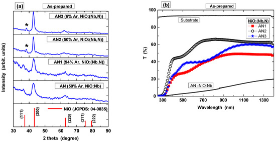 The effect of introducing N in the Nb-doped Ni-O structure on the structural and optical properties of the films just after deposition was examined by XRD measurements and monitoring the UV-Vis-NIR transmittance. The XRD patterns of the as-prepared double-doped AN1, AN2, and AN3 films, along with those of the single-doped NiO:Nb -AN film and the crystal NiO (Joint Committee of Powder Diffraction Standards (JCPDS) card no.: 04-0835), are shown in Figure 3a. As can be seen, there is one main diffraction peak at around 42.6° and two more peaks with much lower intensity at around 36.5° and 62.2°. All diffraction peaks were identified as those arising from the (200), (111), and (220) crystallographic planes, respectively, of the cubic NiO phase. Niobium oxide or any nitride phases could not be detected. The asterisks in Figure 3a denote diffraction peaks originating from the films’ Au metallization pads, which had been applied for performing the electrical characterization of the films (JCPDS card no. 040-0784). The crystallographic parameters, which were extracted from the XRD patterns, like average crystallite size and lattice strain, are tabulated in Table 2.