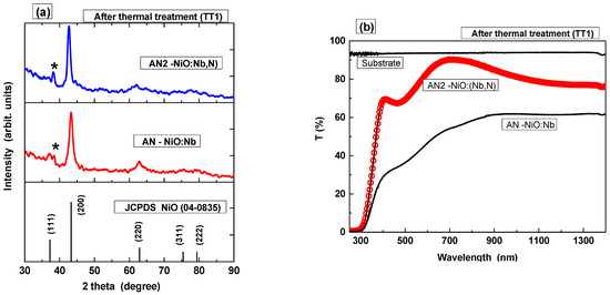 Comparison of (a) XRD 2-theta scans and (b) UV-Vis-NIR transmittance spectra of reference NiO:Nb AN film and NiO:(Nb,N) AN2 film after thermal treatment (TT1). The asterisks denote peaks from the Au pads (JCPDS: 040-0784).