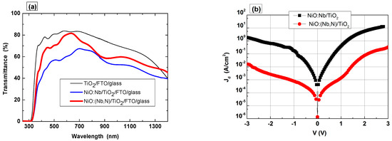 (a) UV-Vis-NIR transmittance and (b) dark current density–voltage (Jd-V) of NiO:Nb/TiO2 and NiO:(Nb,N)/TiO2 diodes.
