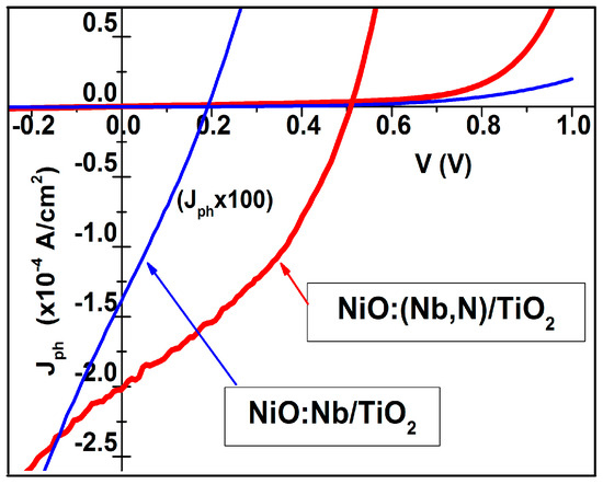 Photo current density–voltage characteristics of the NiO:Nb/TiO2 and NiO:(Nb,N)/TiO2 heterodiodes under UV (λ = 325 nm) illumination. The Jph values of the NiO:Nb/TiO2 heterodiode are multiplied by ×100 for better visibility.