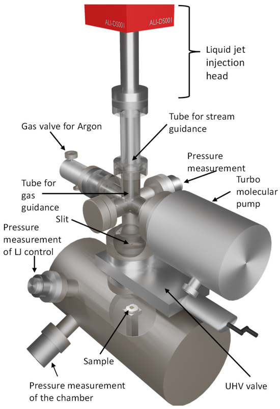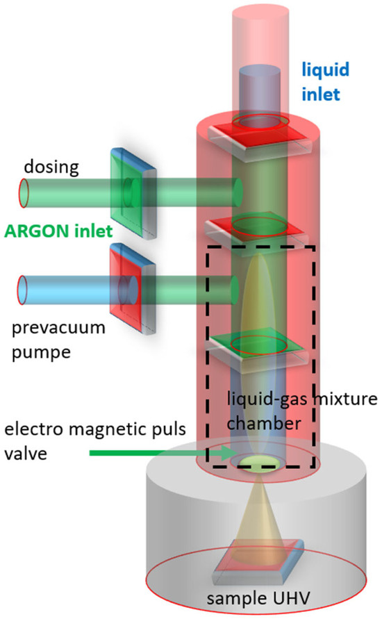 The original injection head, depicted in Figure 1, forms the core component. The LI process is initiated by introducing the solution through an extended cannula (liquid inlet). Using a pre-vacuum line and a gas inlet dosing unit makes it possible to suspend the liquid phase in an inert gas carrier (argon) directly in front of the electromagnetic short pulse valve. The defined mixing of the liquid phase with argon stabilizes the injection process, and, therefore, the dispersion of the molecules once in the vacuum. The valve has an aperture width of 0.1 mm, an opening/closing response time of up to 160 ms, and a leakage ratio of less than 10−7 mbar·s−1. The quick increase in the pressure after opening/closing the valve, in combination with the pumping speed of the vacuum system, causes the droplet to tear, inducing a virtual leak [32]. The original software manages the parameter control for the pulses, pressure equalization control, and pulse counting.