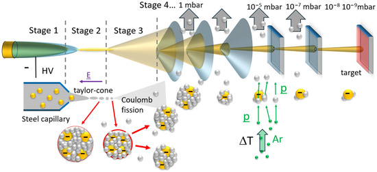 The first stage of the electrospray apparatus includes a nanoflow capillary steel tip measuring 1–10 µm in diameter. A solution containing molecules passes through this tip at a flow rate exceeding 1 µL/min. Applying a high voltage between the tip and ground causes either positively or, in our case, negatively charged molecules to separate and accumulate at the tip’s end. At stage 2, the electrical field acting on these charged molecules in the solvent creates a cone-shaped liquid at the capillary tip’s end, known as the Taylor cone, from which charged droplets are extracted. In stage 3, the shrinking of droplets and increasing charge density disrupt the balance between surface tension force (resulting from the strong attraction of solvent molecules to each other due to cohesion) and Coulomb repulsion between the equally charged target ions. When Coulomb repulsion surpasses surface tension, the droplet undergoes a process called Coulomb fission which results in a nebulization to much smaller droplets. In stage 4 further removal of solvent molecules occurs, and the beam is focused within the pumping stages. After the first aperture, the ions fly field-free to the substrate. To reduce the kinetic energy gained from acceleration in the electric field, an electric counterfield can be applied at the substrate, decelerating the target molecules. This prevents fragmentation upon impact and enables a soft landing [27].