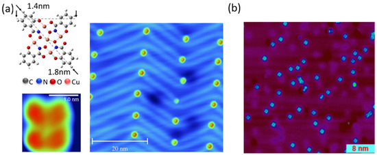 STM images of CuCu4 electrosprayed onto (a) Au(111) (VT = −3 V; I = 55 pA) and (b) Cu(001) (VT = 1.5 V; I = 50 pA). The substrate temperatures were at room temperature during the deposition and at 9.5 K during the measurements. The image (a) is reprinted with permission from Ref. [35]. Copyright 2023 American Chemical Society.