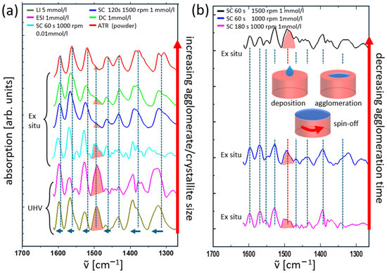 FT-IR transmission spectra of CuCu4 (on Si-wafer) for ex situ and UHV preparation methods. All measurements were performed ex situ. (a) Direct comparison of the ex situ and UHV-prepared layers with a crystallized powder sample (ATR). The marked peak at 1495 cm−1 is evaluated as an indication of the change in crystallinity. (b) FT-IR spectra of spin-coated layers when varying residence time and spin-off frequency. Increasing residence time Δt or decreasing spin-off frequency leads to the formation of larger agglomerates/crystallites, which manifests in an increase in the peak intensity at 1495 cm−1. For details, see text. Adapted from [36].