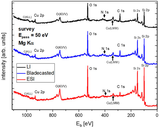 Survey XPS Mg Kα spectra of CuCu4-MCs on SiO2 (wafer surface); prepared by ex situ blade-casting and in situ LI and ESI deposition [42].