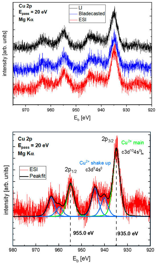 (Top) Cu 2p XPS spectra of CuCu4 on SiO2 (wafer surface); prepared by ex situ blade-casting and in situ LI and ESI deposition. Note the smaller pass energy in comparison to Figure 6. (Bottom) Peakfit with Voigt functions for the ESI-prepared thin film [42].