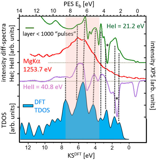 Photoelectron spectra (PES) of the valence band region of a CuCu4 multilayer film on Au(111); prepared by LI with argon flow and substrate heating. Three different excitation energies are used. The data are shown as difference spectra, in which the spectrum of the substrate was subtracted. The dips marked with an asterisk are related to the subtraction. The zero lines are shown as horizontal dotted lines. For comparison, we show the theoretical total density of states (TDOS) in this region for a single CuCu4 molecule in the gas phase (DFT, uB3LYP). Graphic after [33].