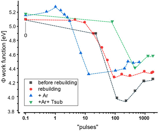 The introduction of an additional pumping stage (red dots) resulted in a higher final work function, and further improvements were observed with the addition of an Ar flow. Heating the sample surface to 50 °C during deposition achieved the highest work function, while additional flange heating did not affect the work function [33]. Nonetheless, flange heating is essential to prevent the material from freezing at the outlet into the UHV system.