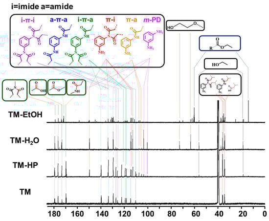 To elucidate the chemical structures of the four products, we performed 13C NMR analysis (Figure 1). The 13C NMR spectrum revealed that all four CPDs possess polycondensed structures based on TA and m-PD, yet they differ significantly in their substructures. Specifically, TM synthesized by airflow melt polymerization exhibits a relatively homogeneous structure, whereas the presence of solvents or condensation-generated H2O in the other three CPDs leads to the formation of impurities and byproducts, such as unreacted m-PD, TA–m-PD dimers, ethyl ester groups, and oxyethanol groups. Comparative studies of 1H NMR (Figure S2) and HSQC (Figure 2) further indicated that phenyl-derived segments are similarly present in all CPDs, albeit in varying proportions. The integrals of phenyl protons corresponding to the terminal m-PD moieties revealed that TM-HP and TM share similar main structures (structures in Figure 1), with identical ratios (1:0.4:0.4) of trimers including i-π-a (green), i-π-i (purple), and a-π-a (blue). In contrast, TM-EtOH and TM-H2O possess more dimer structures of π-i (red), π-a (orange) and monomer m-PD (carmine), which is consistent with the low degree of polymerization observed in the MS results.