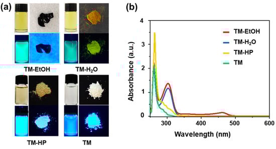 The CPDs synthesized via the four different methods exhibited markedly different colors and absorption properties, suggesting that the degree of polymerization, functionalization, and presence of byproducts significantly influence the optical properties even when the CPDs share the same backbone structure. As shown in Figure 3a, TM-EtOH is a dark brown solid powder without fluorescence, whereas the other three CPDs display distinct solid-state fluorescence emissions in various colors: TM-H2O appears yellow-greenish, TM-HP is cyan, and TM is blue. The quantum yield (QY) of TM in the solid state was measured to be approximately 9.16%, which was much higher than that of TM-EtOH (0.06%), TM-H2O (5.24%), and TM-HP (0.80%) (Figure S3). When dispersed in DMSO solution, TM-EtOH, TM-H2O, and TM-HP appear light yellow under visible light and exhibit fluorescence under UV radiation: TM-EtOH and TM-H2O emit green fluorescence, while TM-HP emits cyan fluorescence. In contrast, the DMSO solution of TM is colorless under visible light but displays bright blue fluorescence under UV light. The UV-Vis absorption spectra recorded at a concentration of 0.1 mg/mL in DMSO reveal that TM and TM-HP have primary absorption bands centered at 250~260 nm, corresponding to n–π* transitions of C=O groups (Figure 3b) [,,]. TM-H2O and TM-EtOH exhibit similar absorption features, with main absorption bands centered around 300 nm, possibly arising from electronic transitions of conjugated structures containing heteroatoms []. Notably, TM-EtOH shows a prominent absorption band at 460 nm in the visible region, indicating the possible presence of larger conjugated derivative structures within their framework.