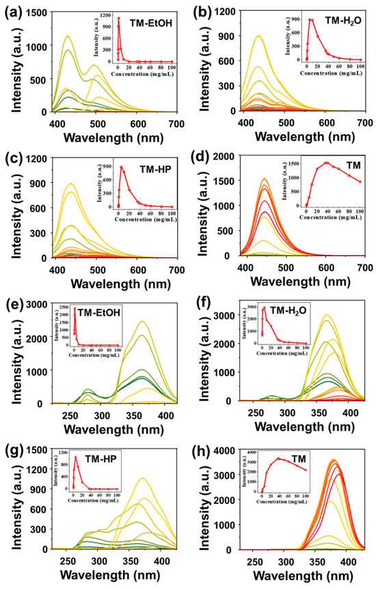 The comparison of emission spectra of (a) TM-EtOH, (b) TM-H2O, (c) TM-HP and (d) TM within the concentration range from 0.01 to 100 mg/mL. The comparison of excitation spectra of (e) TM-EtOH, (f) TM-H2O, (g) TM-HP and (h) TM within the concentration range from 0.01 to 100 mg/mL. The illustration depicts the correlation between fluorescence intensity and the concentrations of four CPDs ranging from 0.01 to 100 mg/mL. The gradient lines transitioning from green to red in the illustration represent varying concentrations ranging from 0.01 to 100 mg/mL.