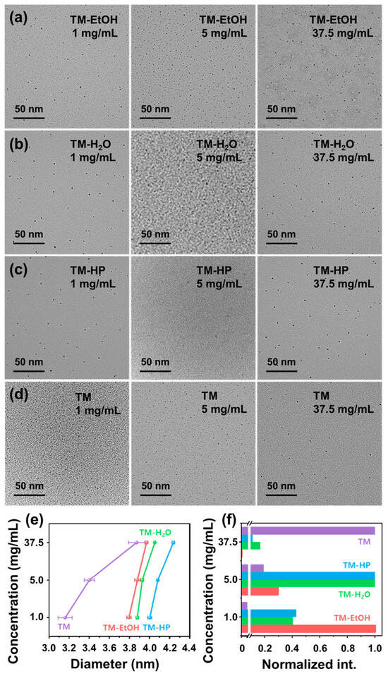 TEM images of (a) TM-EtOH, (b) TM-H2O, (c) TM-HP and (d) TM dispersed at different concentrations under the same magnification. (e) The diagram of TM-EtOH, TM-H2O, TM-HP and TM average particle size versus dispersing concentration. (f) Comparison of normalized fluorescence emission intensities for TM-EtOH, TM-H2O, TM-HP, and TM at various concentrations.