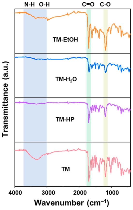 The comparison of ATR-IR spectra of TM-EtOH (orange curve), TM-H2O (blue curve), TM-HP (purple curve) and TM (pink curve). Different background colors highlight distinct functional group contrasts.