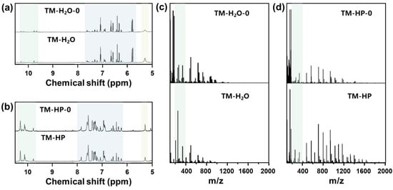 (a) The comparison of 1H NMR spectra of TM-H2O-0 and TM-H2O. (b) The comparison of 1H NMR spectra of TM-HP-0 and TM-HP. (c) The comparison of UPLC-QTOF-MS spectra of TM-H2O-0 and TM-H2O. (d) The comparison of UPLC-QTOF-MS spectra of TM-HP-0 and TM-HP. TM-H2O-0 and TM-HP-0 represent the upper half of the curve in the figure, while TM-H2O and TM-HP correspond to the lower half of the curve.