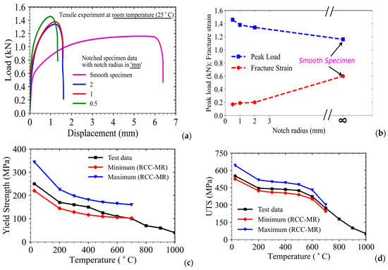 It may be noted that the minimum cross-sectional areas of both smooth and notched type tensile specimens are kept the same so that the effect of notch radius on the change in fracture strain and the notch-strengthening effect can be studied systematically. Tests have been conducted at different temperatures ranging from room temperature (25 °C) to 1000 °C, which covers a very wide temperature range, and it is suitable for both design and integrity analysis at elevated temperatures (i.e., during postulated severe accident scenarios).