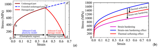 Before proceeding with the discussion regarding the evaluation of parameters of the Johnson–Cook material model, a schematic explanation of the material hardening and softening responses of the material (as presented by the above model) is presented in Figure 3. This figure represents the variation of true stress in the material point as a function of cumulative equivalent plastic strain. The curve as presented in Figure 3a has been divided into two parts, i.e., the plastic hardening part represented by the Johnson–Cook plasticity model (Equation (1)) and the damage region represented by the Johnson–Cook damage model (Equation (4)). Once the critical value of equivalent plastic strain for damage as presented in Equation (4) is reached in the material point during the ongoing deformation, damage initiation and propagation start, which simulates the void nucleation, growth, and coalescence in ductile materials.