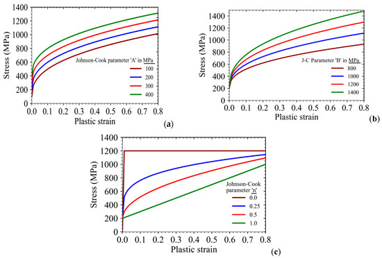 The strain rate hardening and thermal softening behavior of the material (as presented through the Johnson–Cook model) have been presented schematically in Figure 3b. This model, when coupled with the damage model, as presented in Figure 3a, constitutes the complete Johnson–Cook material model. There are three parameters of the Johnson–Cook plasticity model, i.e., A, B, and ‘n’. The third parameter represents the conventional plastic strain hardening coefficient of the material. The effect of these three parameters on the material’s true stress-strain curve is shown in Figure 4.