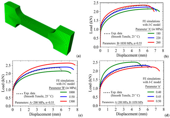 (a) Three-dimensional finite element mesh of smooth tensile specimens as used in experiments; (b–d) Effect of Johnson–Cook model parameters A, B, and ‘n’ on load-displacement response of smooth tensile specimen.