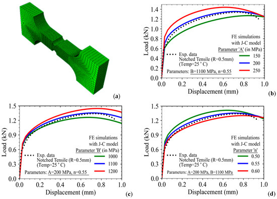 (a) Three-dimesional finite element mesh of the notched tensile specimen with 1 mm notch radius as used in experiments; (b–d) Effect of Johnson–Cook model parameters A, B, and ‘n’ on load-displacement response of the notched tensile specimen.