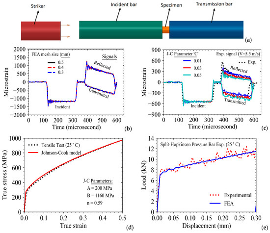 (a) Schematic arrangement of specimen, striker, and the bars in Split-Hopkinson Pressure Bar (SHPB) test setup; Effect of (b) mesh size of the specimen and (c) Johnson–Cook model strain-rate-dependent paremeter ‘C’ on incident, transmitted and reflected microstrain vs. time signal as obtained from FE analysis of SHPB test; (d) Evaluation of Johnson–Cook plasticity parameters A, B and ‘n’ from quasistatic stress-strain data; (e) Comparison of load-displacement data of SHPB test with that predicted using FE analysis.