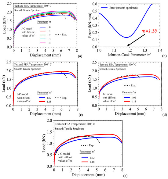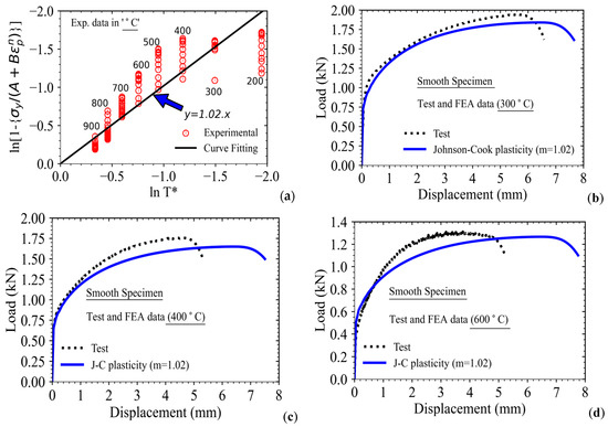 (a) Evaluation of Johnson–Cook temperature-dependent parameter ‘m’ using tensile test data at different temperatures; Comparison of load-displacement response of the smooth tensile test as obtained from FE analysis using Johnson–Cook model with experimental data for test temperatures of (b–d) 300 °C, 400 °C, and 600 °C respectively.