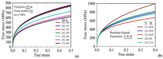 The zero value of strain hardening represents elastic-perfectly plastic material behavior. The effect of these individual parameters provides insight into the process of evaluation of these parameters from the experimentally obtained material stress-strain data and compares the relative plastic hardening response of different types of materials and alloys. The effect of these three parameters, however, becomes clearer once these are used in FE simulations of both smooth and notched type tensile specimens as presented in Figure 5 and Figure 6, respectively.