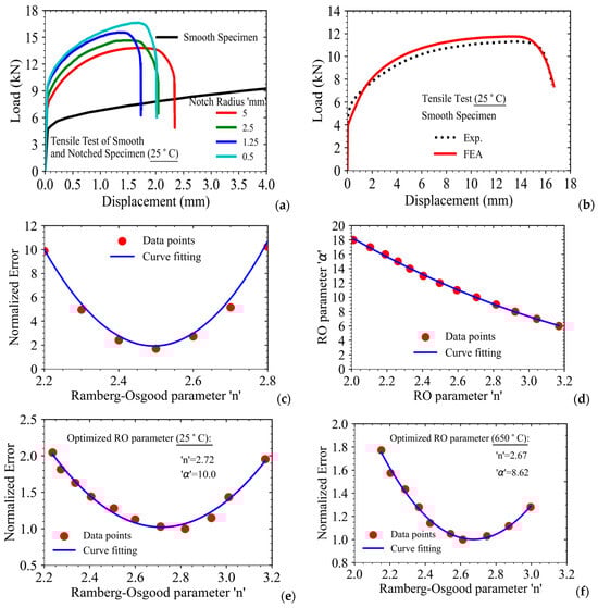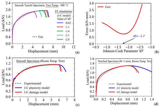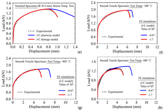 This discrepancy between experimental and FE analysis results can be explained from the context of the development of damage in the notched regions of the notched tensile specimens. In these parametric study examples presented in Figure 5 and Figure 6, the effect of material damage as represented by the Johnson–Cook damage model (i.e., Equation (4)) has not been considered, and hence, the plasticity model alone is not able to simulate the experimentally observed nature of load drop in notched tensile specimens. In smooth specimens, the damaging effect is not reflected in the load-displacement curve predominantly as the initiation of necking due to geometrical nonlinearity reduces the load-carrying capability of the specimen drastically due to a sudden change in the load-carrying cross-section (i.e., after the onset of necking in the specimen).