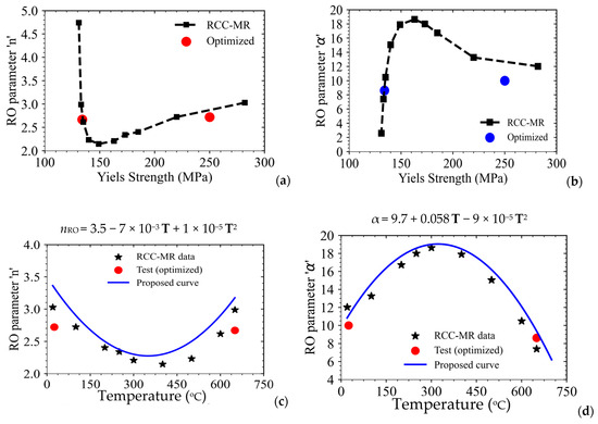 The decrease in yield strength (YS) is not so rapid as compared to the change in UTS values, as YS signifies the onset of plastic deformation (or the process of initiation of yielding), and hence, the effect of microstructural instabilities becomes significant only at larger magnitudes of plastic deformations, and hence, it affects the UTS more. The mechanical properties (YS and UTS), as evaluated in this work, have also been compared with lower and upper-bound data of the same material, as presented in the French design and safety analysis code RCC-MR [3]. However, RCC-MR does not provide data up to 1000 °C as can be seen from Figure 2c,d. It can be observed that our data follows the trend of RCC-MR data for the whole temperature range, and these test data are also within the two statistical bounds of RCC-MR data. After evaluation of temperature-dependent mechanical properties and the true stress-strain curves for SS316LN, we have used the information to evaluate the parameters of material constitutive models, such as those of Johnson–Cook and Ramberg–Osgood. The process of evaluation of the parameters of these models, using conventional procedures, has some issues, which have been addressed in the subsequent sections.