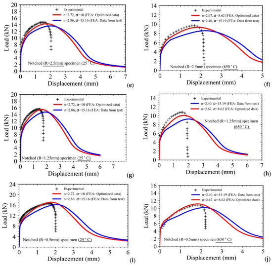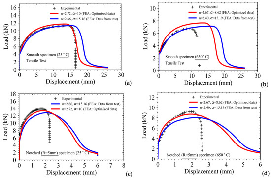 This shall be clearer once we compare the results of the FE analysis of high-temperature tensile tests with those of experiments using the parameter ‘m’ (estimated using the conventional method). The value of ‘m’ has been estimated to be ‘1.02’ as can be seen from the slope of the best-fit straight line in Figure 8a. The load-displacement results of the FE simulation, as obtained from the analysis of smooth tensile specimens at different temperatures, are presented in Figure 8b–d.