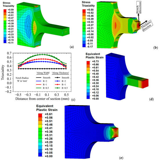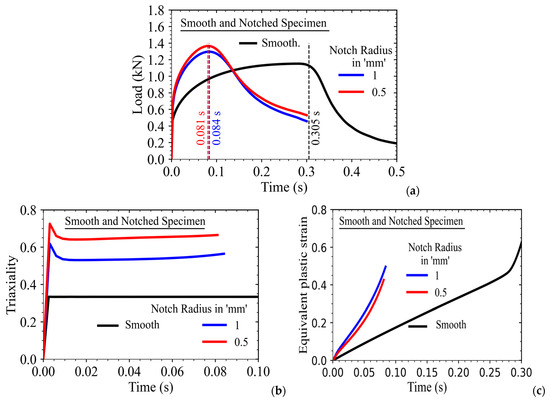 Moreover, the fracture displacement (and strain) also reduces with decreasing notch radius of the specimen and increasing stress triaxiality as presented in Figure 2a,b. The peak load-carrying capacity of the notched specimen also increases with decreasing notch radius, as presented in Figure 2a,b, and this phenomenon is also known as the notch-strengthening effect. However, it may be noted that the material true stress-strain curve, as used in material constitutive models in FE analysis (which uses von Mises criteria), is independent of stress triaxiality in the specimen, and hence, the notch strengthening is a geometrical phenomenon.