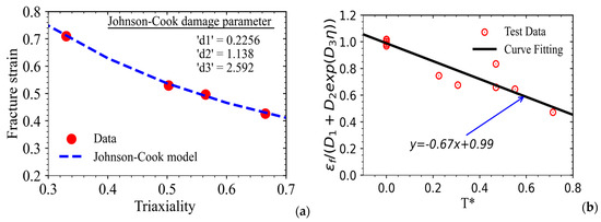 The model as presented in Equation (4) expresses equivalent plastic stain at damage (which is a critical value of equivalent plastic strain at which the onset of material degradation occurs and the material point subsequently loses its stress-carrying capability by reducing the strength in an exponential decay-type manner) as a function of stress triaxiality, strain rate, and normalized temperature.