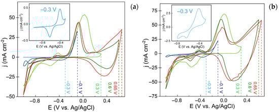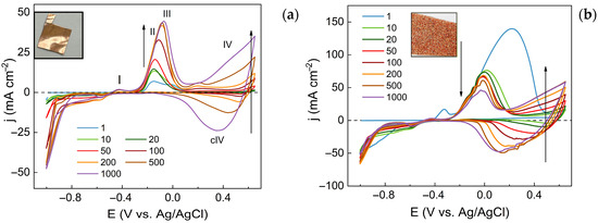 The synthesis of nanostructured copper-based films on foil and foam electrodes was conducted by cycling the applied potential between −1.0 V (cathodic) and 0.65 V (anodic) for up to 1000 cycles. The resulting curves are presented in Figure 1a (for foil) and Figure 1b (for foam).