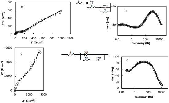 - R1 = 1.703 Ω cm2; R2 = 6431 Ω cm2; CPE1 = 1.01·10−4 (F cm−2)0.938; n1 = 0.938; CPE2 = 0.422 (F cm−2)0.804; n2 = 0.804 (Figure 3c,d).