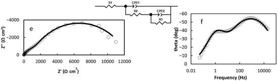 - R1 = 9.502 Ω cm2; R2 = 2452 Ω cm2; CPE1 = 2.155·10−5 (F cm−2)0.666; n1 = 0.666; CPE2 = 4.003·10−5 (F cm−2)0.775; n2 = 0.775 (Figure 3e,f).