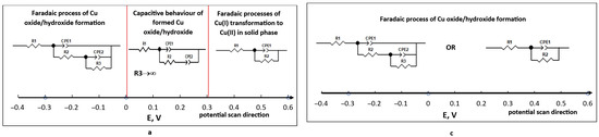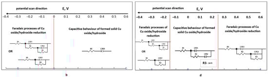 It is noticeable that the film formation processes occur differently on the foil and foam electrodes (Figure 4). On the foil electrode, anodic film is formed at potentials ranging from −0.4 V to 0.0 V (Figure 4a). Then, at the potential ranging from 0.0 V to 0.3 V, obtained films exhibit capacitive behaviour, as the values of R3 are approaching infinity, while the charge transfer resistance R2 takes on finite values from 1576 to 78013 Ω cm2. This means that the direct current can pass through the circuit until the maximum amount of the film is formed. At higher anodic potentials, another faradaic process is occurring, namely transformations in the solid phase, and the EIS of this process can be modelled by well-known modified Ershler–Randles EEC (Figure 4a). When oxide/hydroxide film on the copper is already formed, and the potential is changing from 0.6 V to −0.4 V (Figure 4b), the synthesized film shows capacitive behaviour up to a potential of 0.0 V. When the potential further decreases, the reduction of the formed film begins, and EIS is fitted to the EEC typically described by the faradaic processes occurring on the electrodes (Figure 4b).